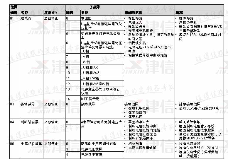 SEW變頻器故障代碼,包括主故障代碼和子故障代碼,下表是F01,F(xiàn)03,F(xiàn)04,F(xiàn)06故障的相關(guān)內(nèi)容: