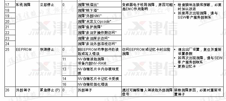 SEW變頻器故障代碼F17,F(xiàn)18,F(xiàn)19,F(xiàn)20,F(xiàn)21,F(xiàn)22,F(xiàn)23,F(xiàn)24,F(xiàn)25,F(xiàn)26,具體如下: