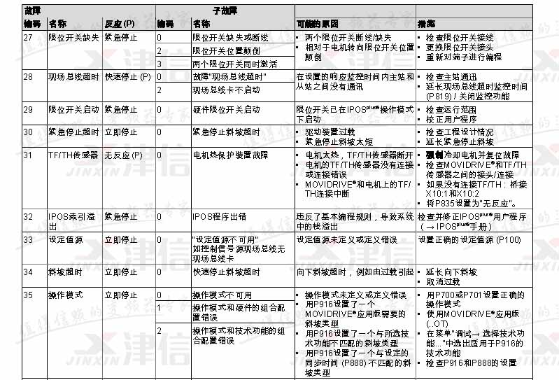SEW變頻器故障代碼F27,F(xiàn)28,F(xiàn)29,F(xiàn)30,F(xiàn)31,F(xiàn)32,F(xiàn)33,F(xiàn)34,F(xiàn)35,具體如下: