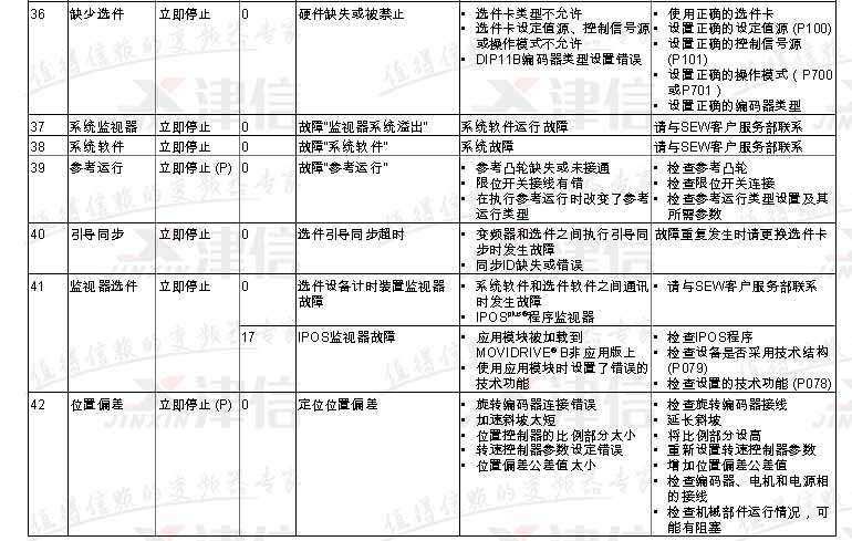 SEW變頻器故障代碼F36,F(xiàn)37,F(xiàn)38,F(xiàn)39,F(xiàn)40,F(xiàn)41,F(xiàn)42,具體如下: